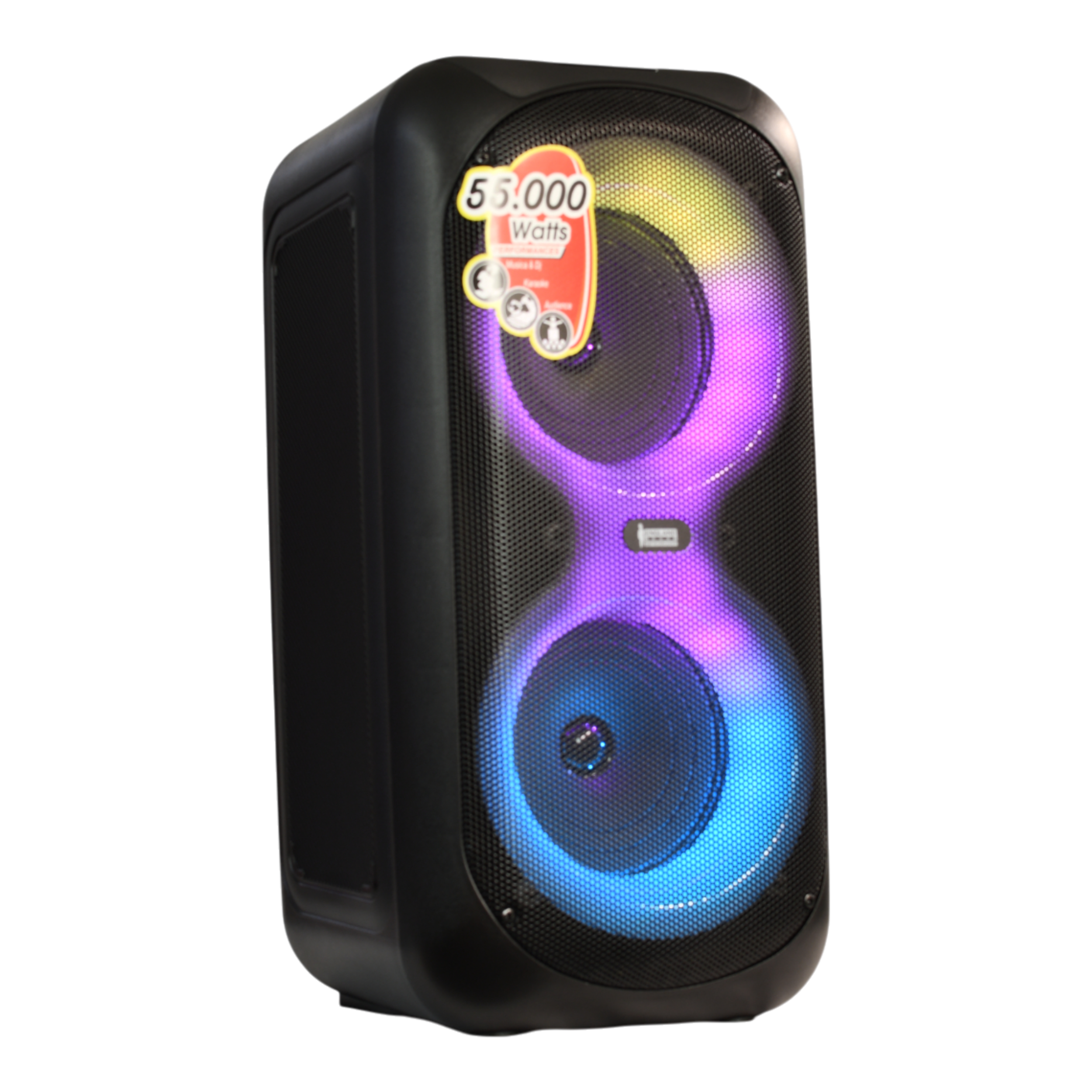CAJA AMPLIFICADA CON BATERIA 2X6″, REPRODUCTOR ANALOGICO DIGITAL, ENTRAJA JACK 1/4, 3.5MM, BASS & TREBLE, LUZ LED RGB, INCLUYE UN MICROFONO